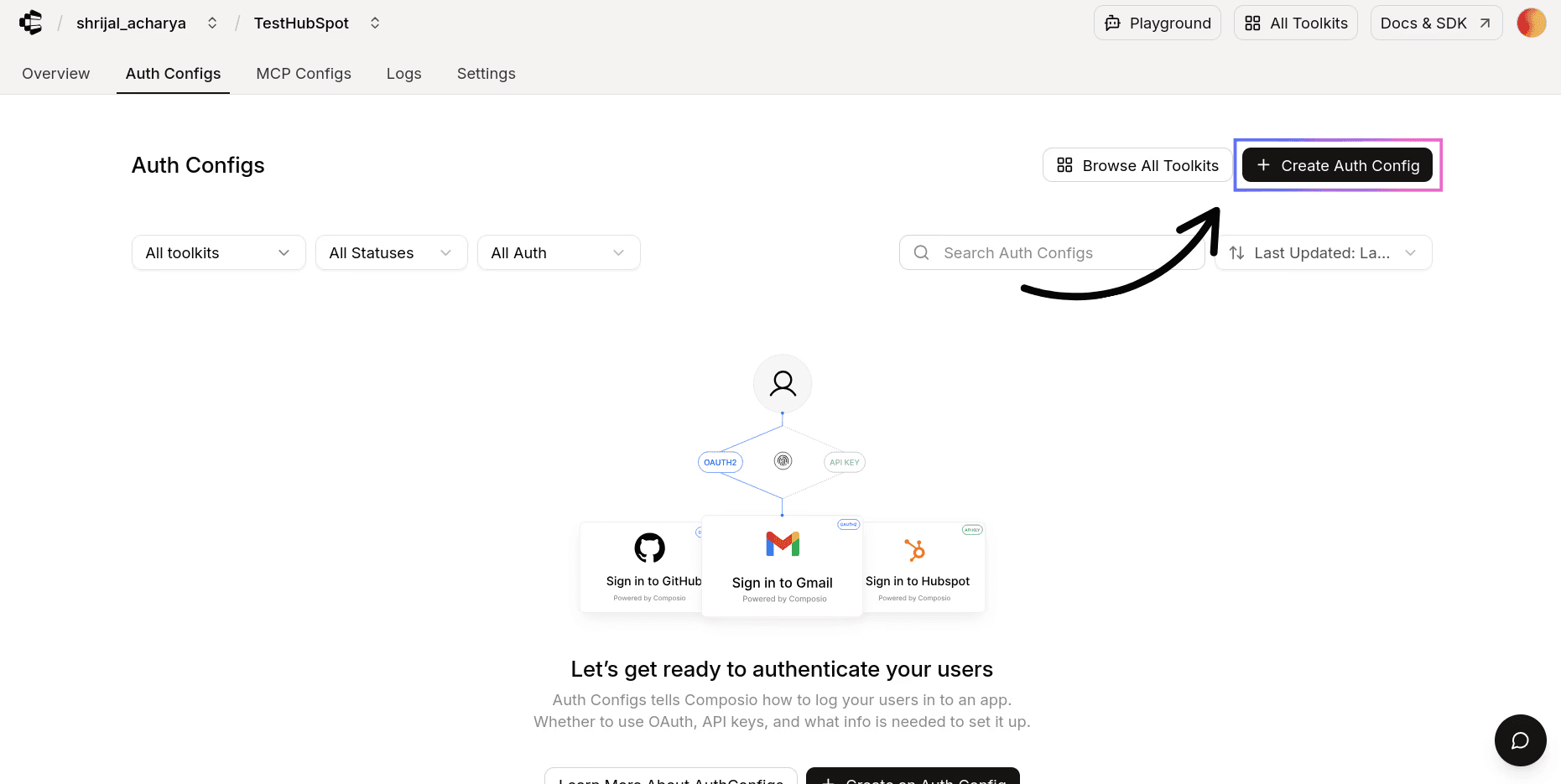 Click on the Create Auth Config button to get a list of all the toolkits available.