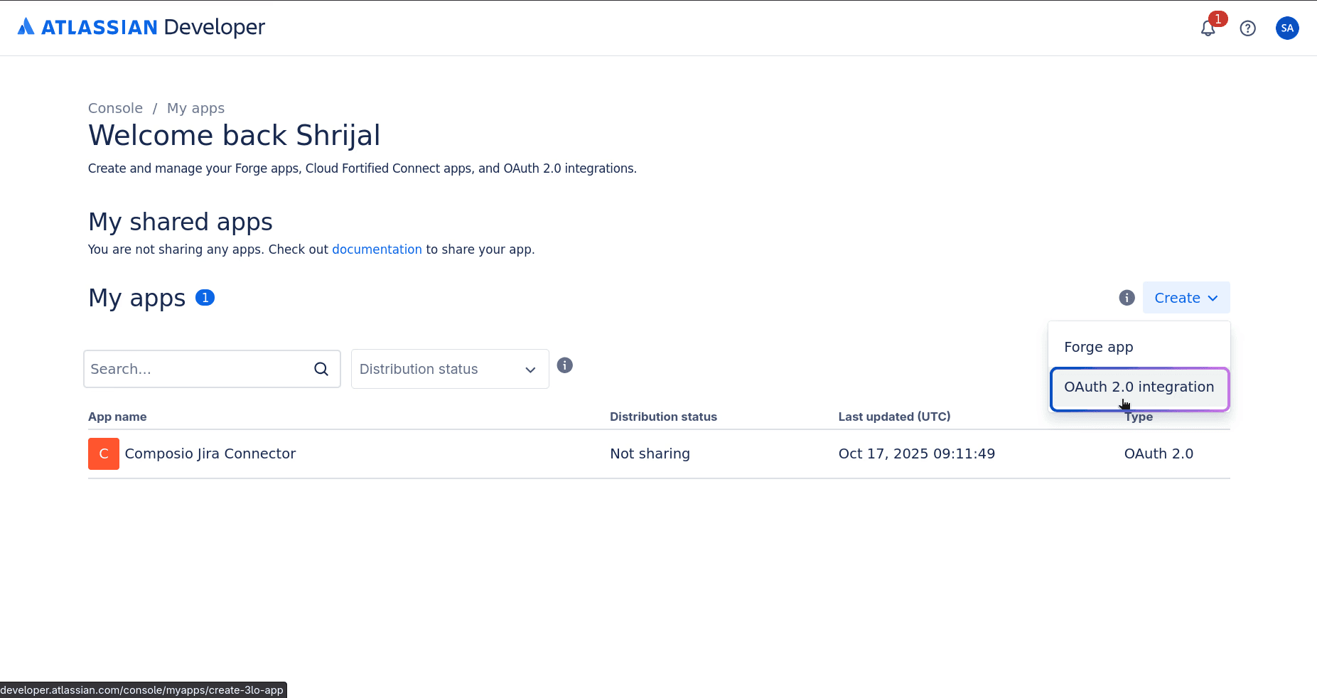 Now, head over to the Atlassian Apps Console and create an application of the OAuth 2.0 Integration type.