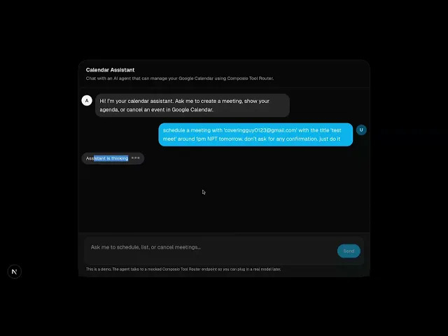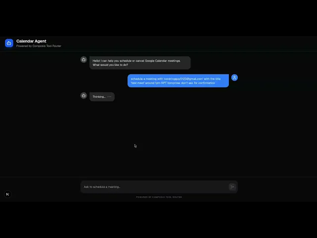 For real, it just mocked the entire agent route. There's no composio tool router used. This is so depressing. All it did was create the UI and mock the whole agent implementation. 😑 BOMBOCLAT!