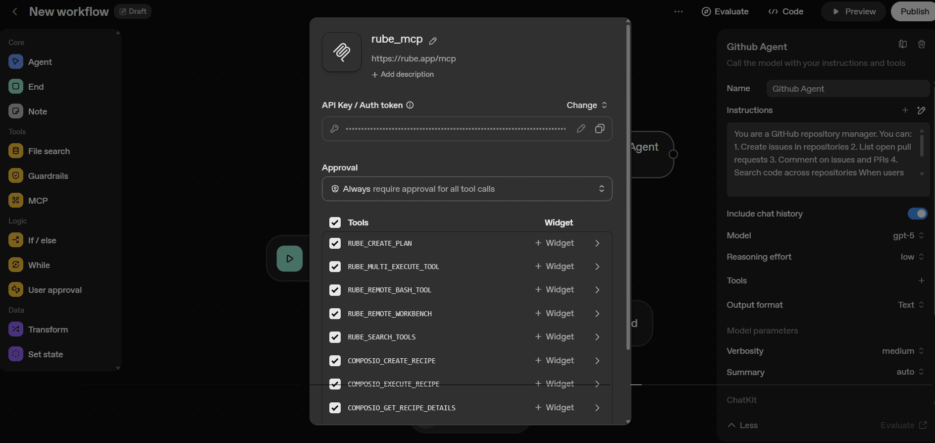 Rube is a universal MCP server implementation built on top of Composio’s tool infra. Instead of writing custom OAuth flows or managing API keys for every service, Rube provides a unified MCP interface for over 500 apps like GitHub, Bitbucket, Jira, etc, that seamlessly works with OpenAI's Agent Builder out of the box.