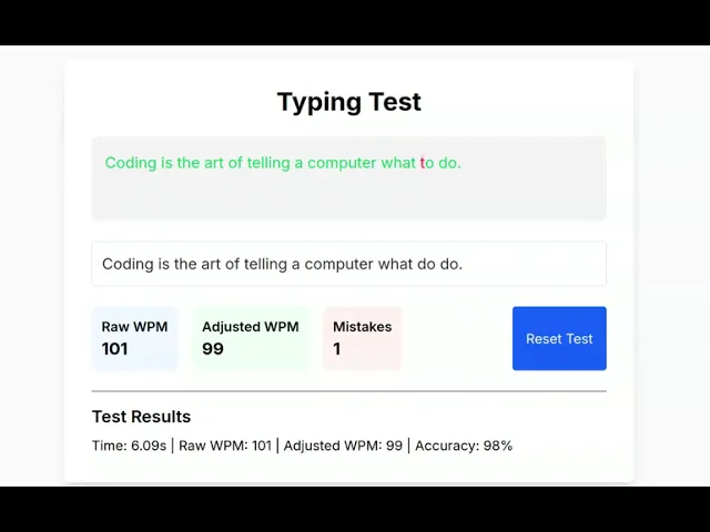 In no time, with everything implemented correctly, it built this entire typing test site with more than what I asked for. It even added an accuracy display.