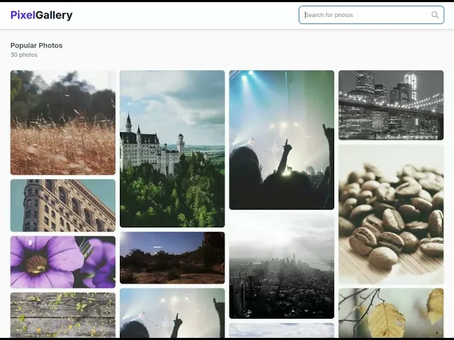 Prompt: Build a Next.js image gallery with a masonry grid, infinite scrolling, and a search bar for filtering images by keywords. Style it like Unsplash with a clean, modern UI. Optimize image loading. Place all code on page.tsx