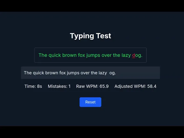 Prompt: Build a Next.js basic typing test app. Users type a given sentence with mistakes highlighted in red, allowing corrections. Display real-time typing speed, both raw (with errors) and adjusted (without errors). Once the user types to the end, the test should be over. Place all code in page.tsx