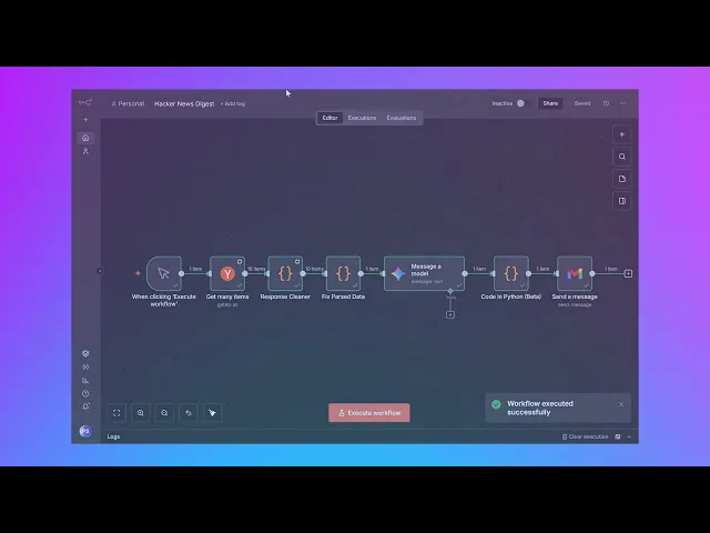 As you can see, a simple newsletter sending in n8n requires fetching, cleaning the output from both the API and the LLM, and then sending, i.e., seven nodes with low-quality formatting (manual plumbing required).