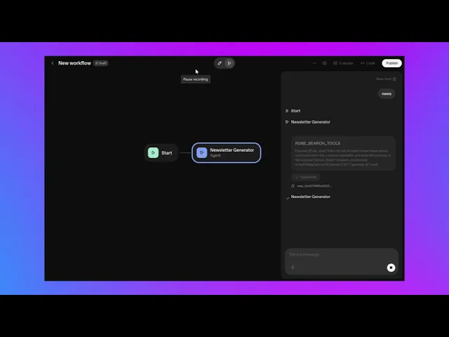 **Agent → Handles core logic with prompt defined in agent_builder_prompt.md . As can be seen, the prompt states that the Rube-MCP tool is used. To fetch news from Hacker News, generate an HTML output and send to Gmail using the Rube MCP tool.