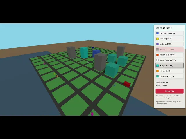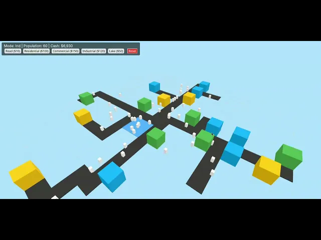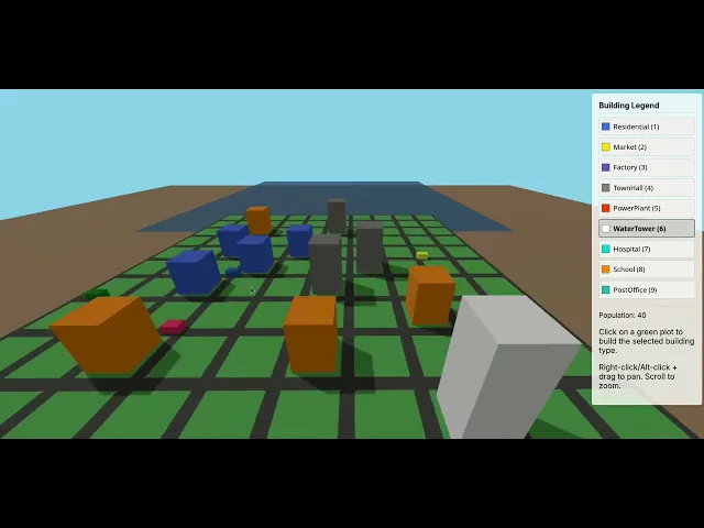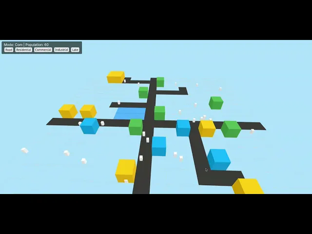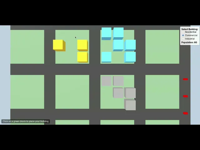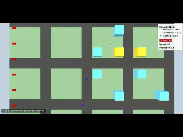 Prompt: Build a SimCity-style simulation MVP using JavaScript with a 3D grid map (Three.js). Users can place colored buildings (residential, commercial, industrial), switch types, and see population stats. Include roads, blocky structures, and moving cars.