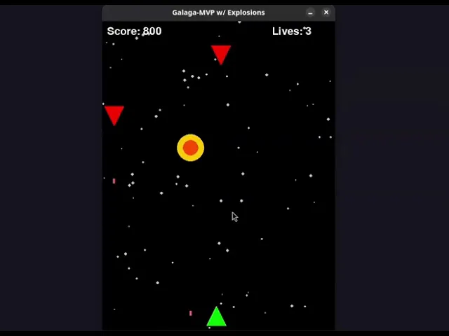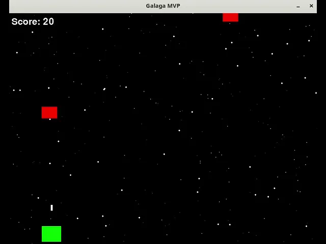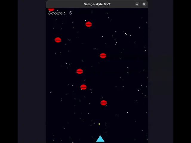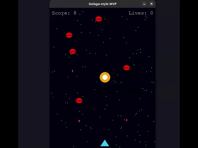 Prompt: Make a Galaga-style space shooter MVP in Python. Use pygame. Add multiple enemies that spawn randomly at the top. Let me shoot bullets upward. Add a score counter and a background with stars for that classic arcade vibe.