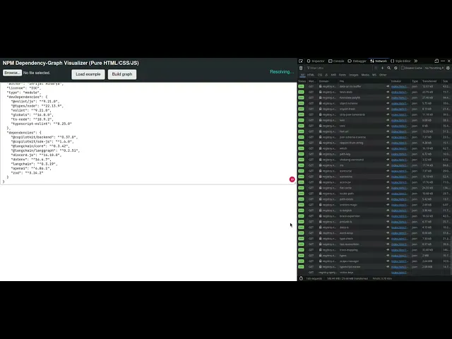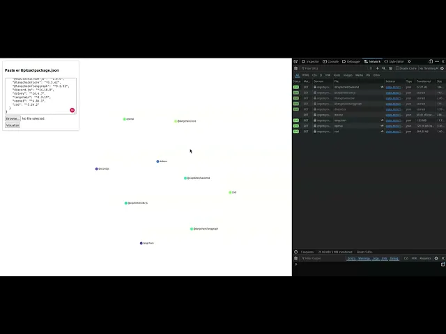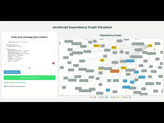 Prompt: Build a dependency graph visualizer for JavaScript projects. The app should accept a pasted or uploaded package.json