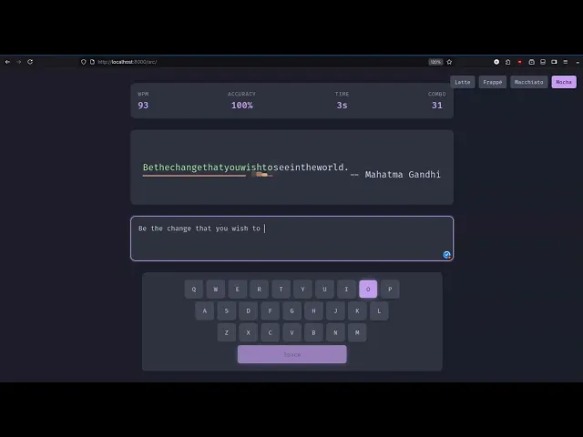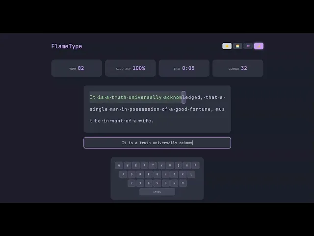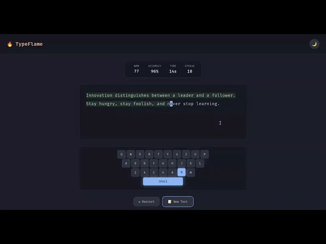 Prompt: Build a modern, highly responsive typing game inspired by Monkeytype, with a clean and elegant UI based on the Catppuccin color themes (choose one or allow toggling between Latte, Frappe, Macchiato, Mocha). The typing area should feature randomized or curated famous texts (quotes, speeches, literature) displayed in the center of the screen. - *Key Requirements:** - The user must type the exact characters, including uppercase and lowercase, punctuation, and spaces. - As the user types correctly, a fire or flame animation should appear under each typed character (like a typing trail). - Mis-typed characters should be clearly marked with a subtle but visible indicator (e.g., red underline or animated shake). - A minimalist virtual keyboard should be shown at the bottom center, softly glowing when keys are pressed. - Include features such as WPM, accuracy, time, and combo streak counter. - Once the user finishes typing the passage, show a summary screen with statistics and an animated celebration (like fireworks or confetti). - **Design Aesthetic:** - Soft but expressive, using the **Catppuccin**