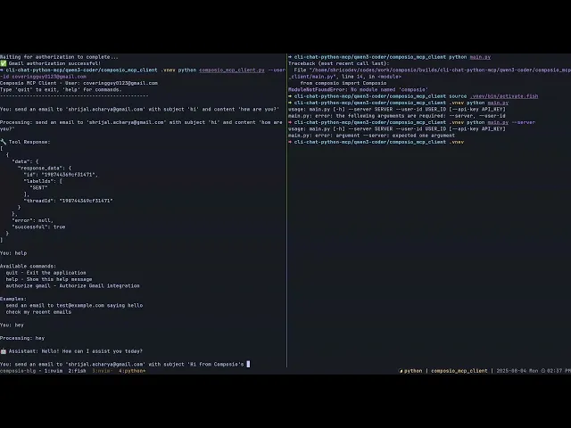 💁 Prompt: Build a CLI chat MCP client in Python. More like a chat room. Integrate Composio for tool calling and third-party service access. It should be able to connect to any MCP server and handle tool calls based on user messages. For example, if a user says "send an email to XYZ," it should use the Gmail integration via Composio and pass the correct arguments automatically. Ensure the system handles tool responses gracefully in the CLI. Follow this quickstart guide: https://docs.composio.dev/docs/quickstart