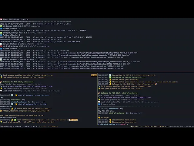 For this one, I decided to do something crazy. Instead of a regular chat agent using Next.js, why not build the same thing for the terminal? It should be a chat room where multiple users can connect and chat, and most importantly, have the feature to utilise integrations (E.g., Gmail, Slack).