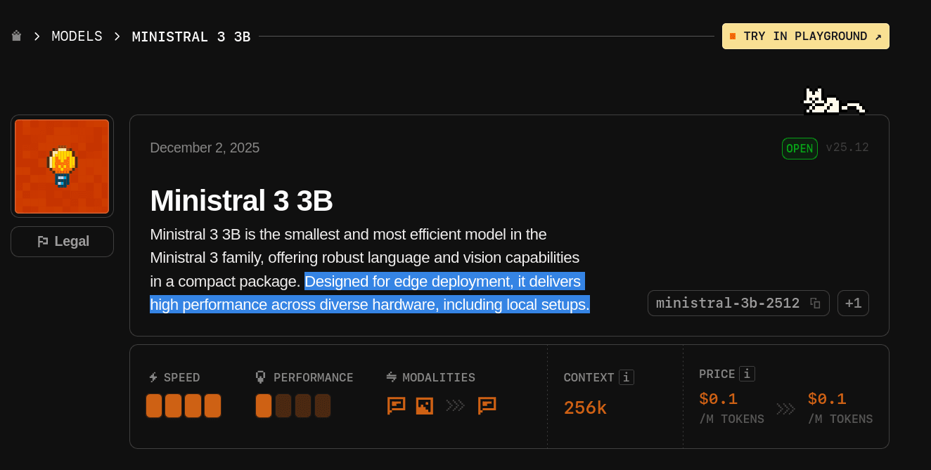 Ministral 3 3B is the smallest and most efficient model in the Ministral 3 family. Mistral 3 includes three state-of-the-art small-dense models: 14B, 8B, and 3B, along with Mistral Large 3, the most capable model to date from Mistral. All models in this family are open source under the Apache 2.0 license, which means you can fine-tune and use them commercially for free.