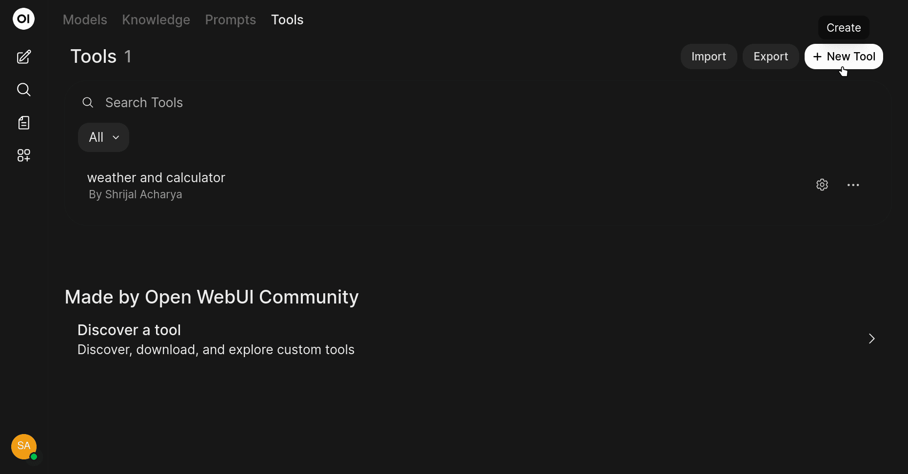 Head over to the Workspace tab in the left sidebar, and in the Tools section, click on the "+ New Tool" button, and paste the following code: Local Tools